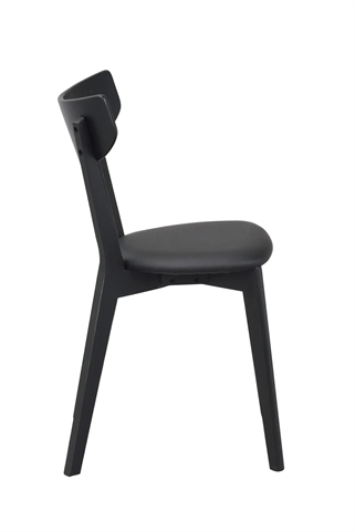 Sædet er polstret i et mørkt, blødt materiale, som giver en behagelig siddeoplevelse – også når måltidet eller samtalen varer lidt længere. Udtrykket er enkelt, harmonisk og tidløst, og stolen passer smukt sammen med både lyse, naturlige træborde og mørkere, mere markante spiseborde.