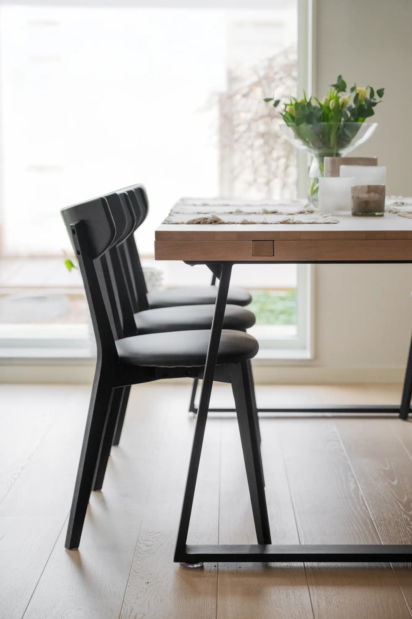 Ami i sort er en stol, der giver rummet ro og sammenhæng, uden at kræve opmærksomhed. Den er skabt til hverdagen, til gæster, til stille morgener og lange aftener – en stol, der føles naturlig at leve med.