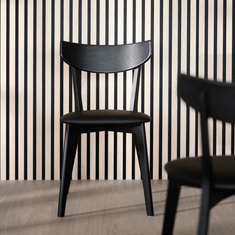 Ami spisebordsstolen i sort fra Rowico har et roligt og underspillet udtryk, der falder naturligt ind i spiseområdet. Stel og ryg er udført i sortlakeret egetræ, hvor træets struktur stadig kan anes, så stolen ikke opleves tung, men elegant og levende i overfladen. Formen er blød og afrundet, hvilket giver stolen en lethed, der klæder både små og store rum.