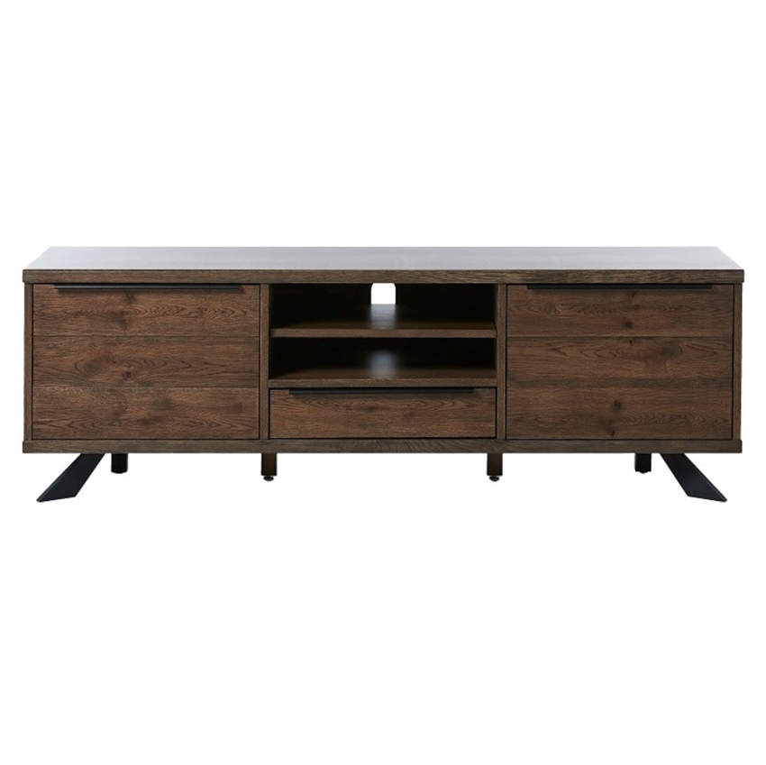 Oplev det elegante TV - bord fra Nordic Design, som er fra deres Elegance serie. TV - bordet er udført med sorte metal ben, samt med ege finer med et mørket røget finish. Disse design elementer er essensen af den populære Elegance serie fra Nordic Design. Serien består af rustikke og stilfulde møbler, som designmæssigt passer perfekt til den industrielle og levende møbelstil.