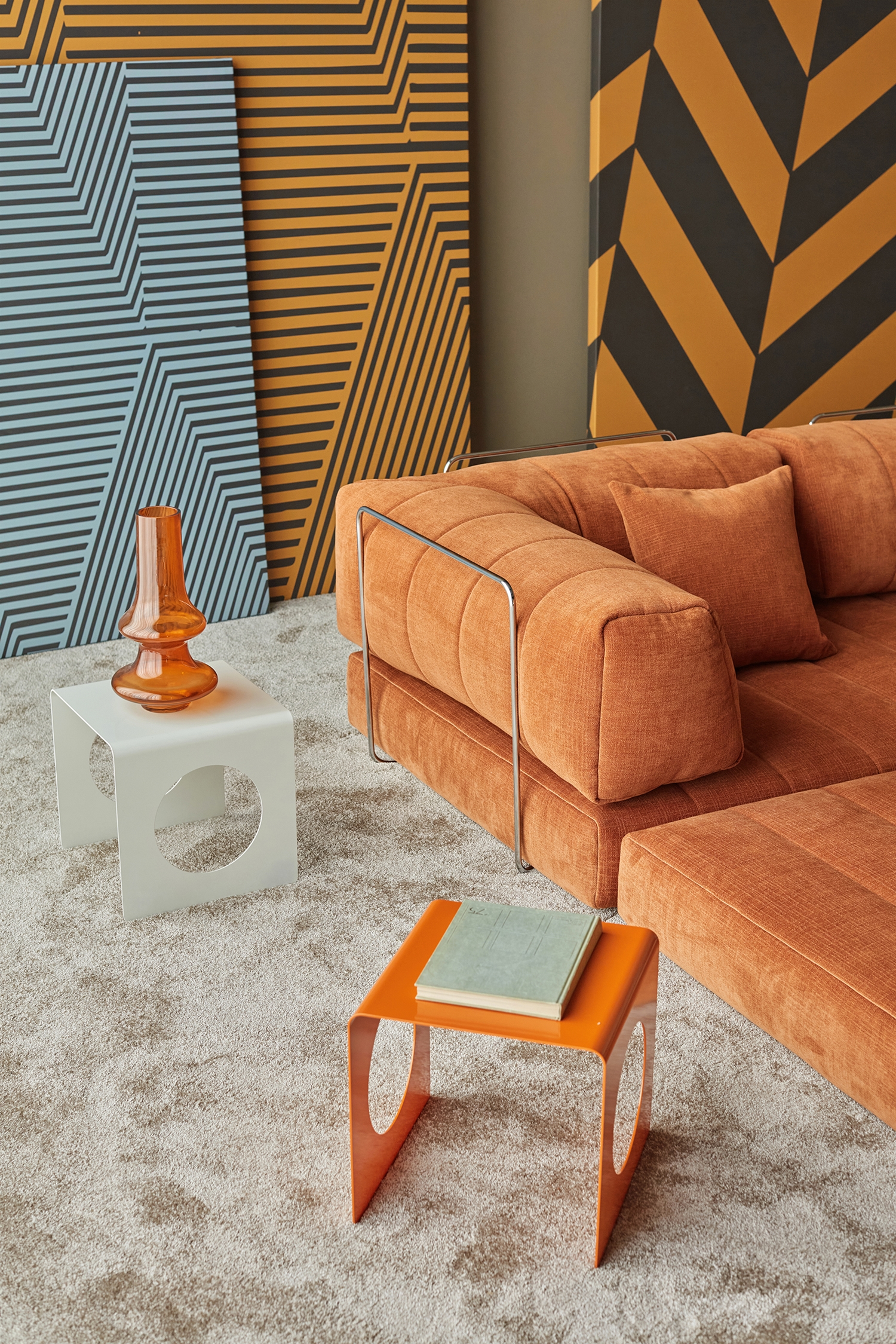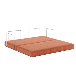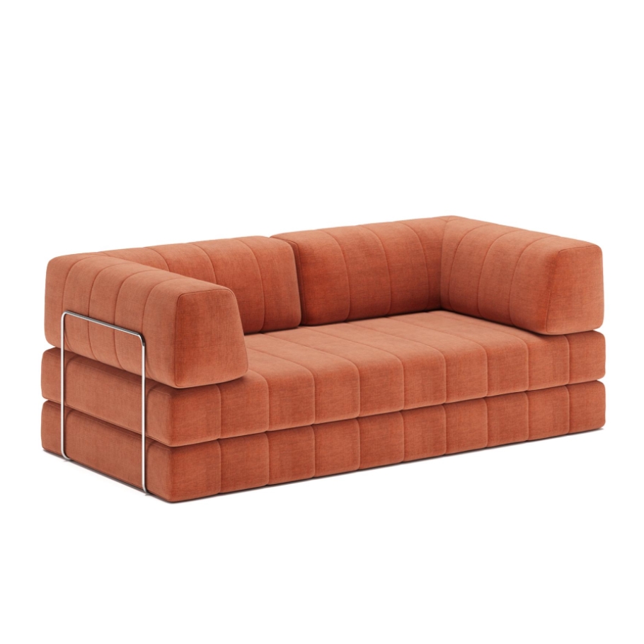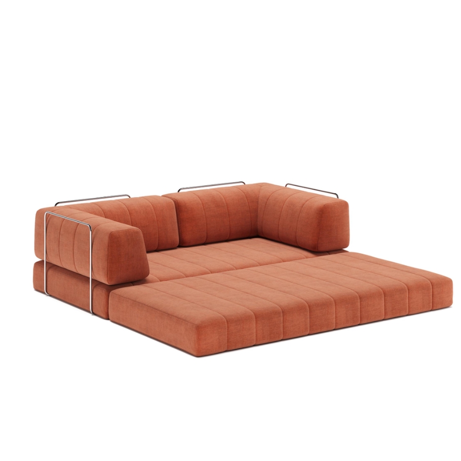 De polstrede armlæn er indrammet af en elegant krombelagt metalbar, der giver sofaen struktur og lethed på samme tid. Kombinationen af det bløde tekstil og den kølige, skinnende metalfinish skaber et visuelt modspil, der gør konstruktionen både stabil og raffineret. CozyPad fungerer som et naturligt samlingspunkt – både til afslapning, til uformelle samtaler eller som et sted at lægge sig med en bog og lade dagen falde på plads.
