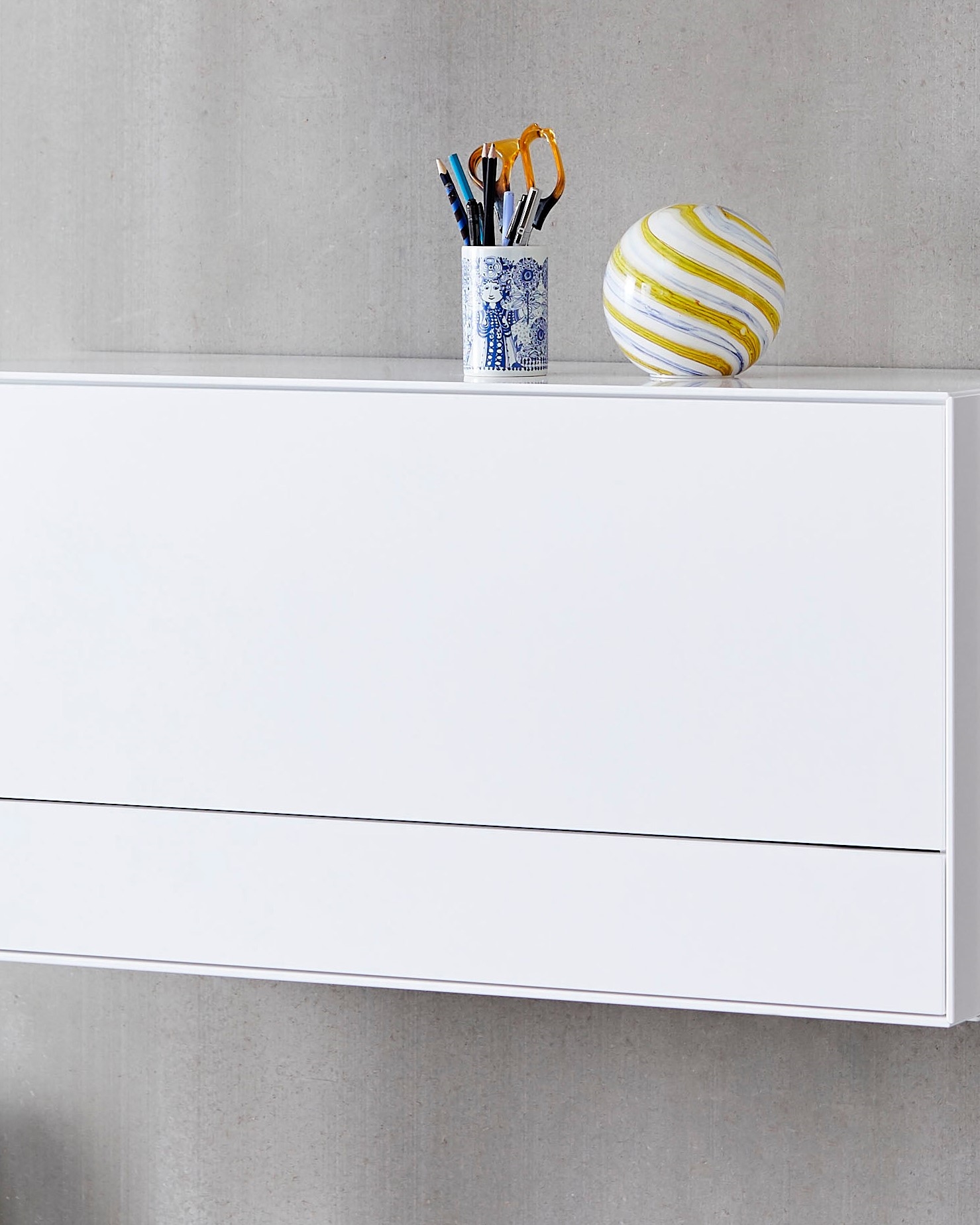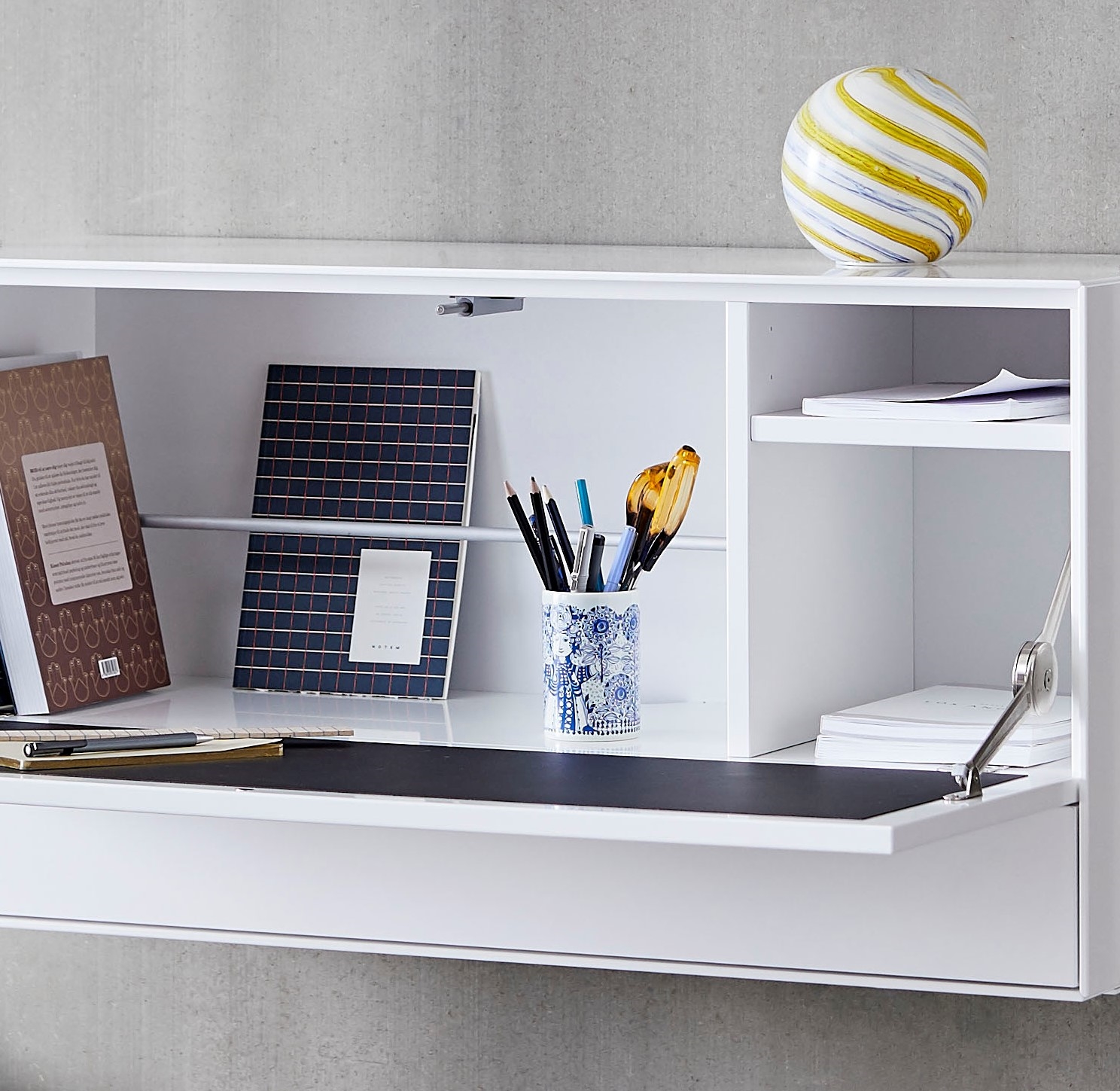 Dette flotte og praktiske skrivepult fra Edge by Hammel, er bestående af 1 rummelige skuffe og klaplåge - begge med push funktion. Bag klaplågen er en metalstang, skillerum, hylde og skriveunderlag. En ekstra detalje er hul i bunden af skrivepulten til kabelgennemføring. Skrivepultet kan væghænges eller bruges med Edge by Hammels vangesystem.