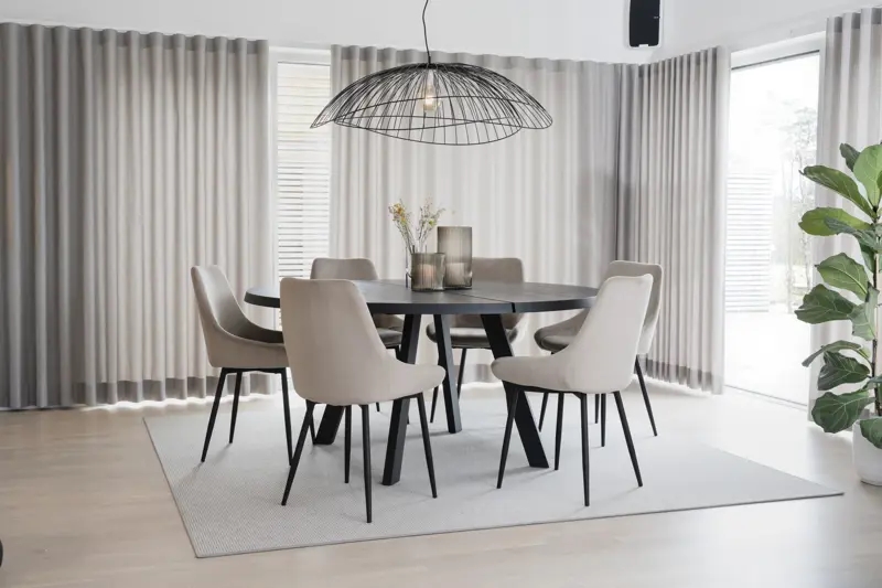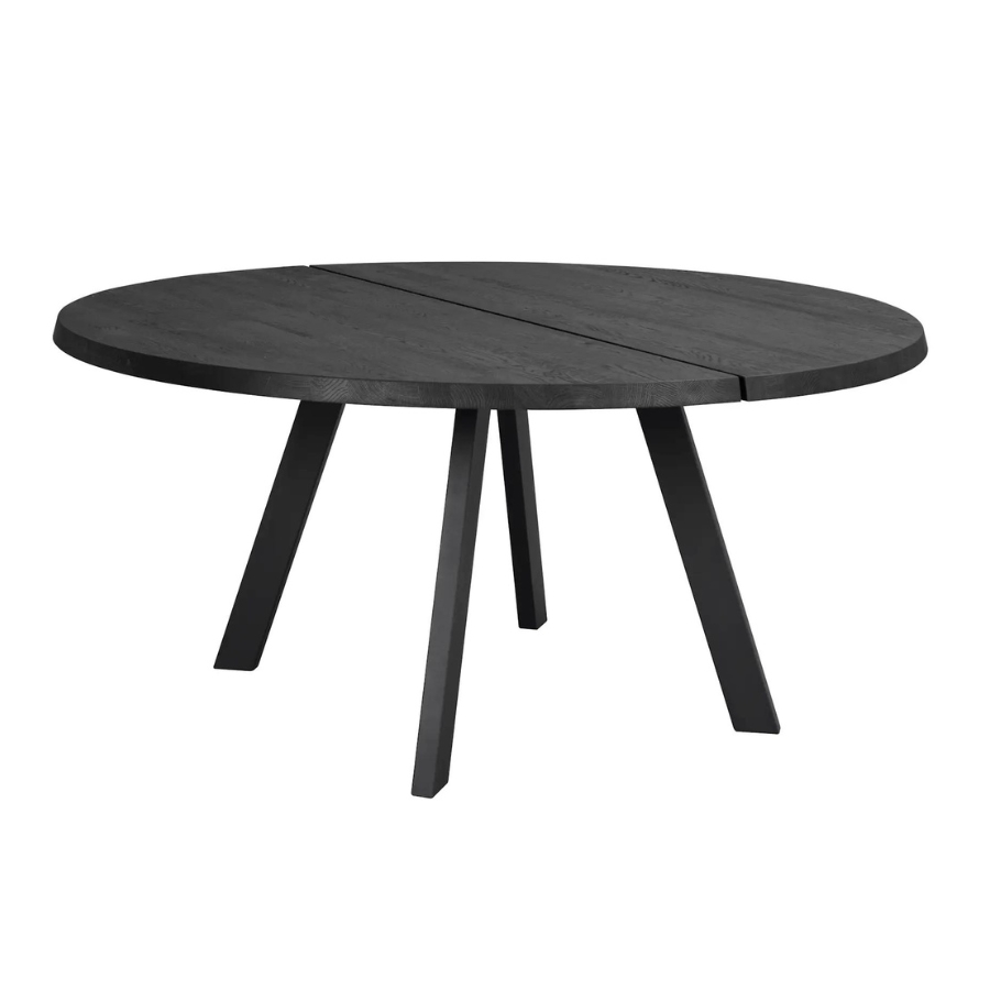 Bordpladen på det runde spisebord, bliver kombineret med flotte ben som er bestående af pulverlakeret sort metal. Bordet har et moderne design, og har en lang holdbarhed, som gør det perfekt til hjemmet.