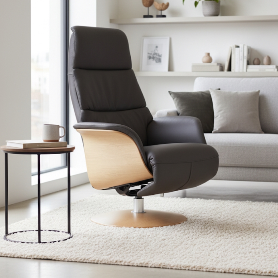 Den flotte lænestol er udført i sort semianilin læder med egetræ på siden, som giver et unikt design. Lænestolen har en høj siddekomfort og en flot sokkel i egetræ.