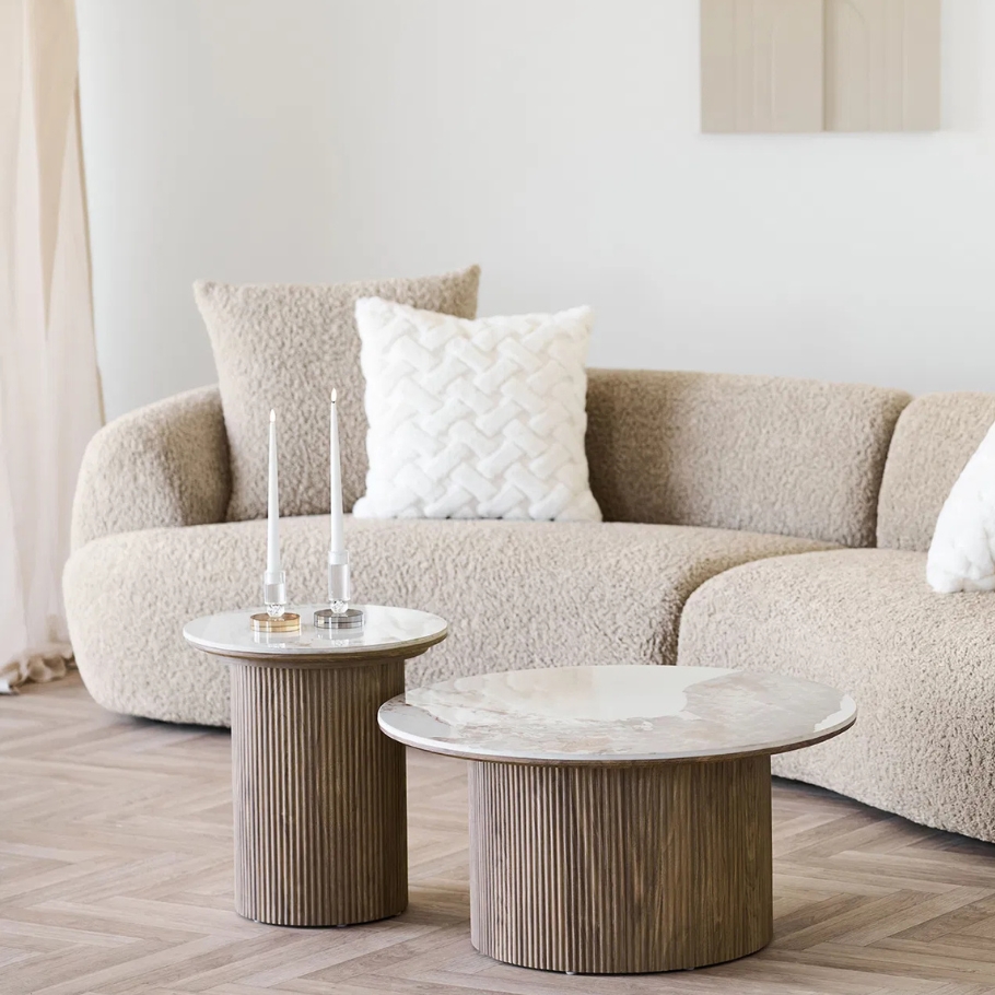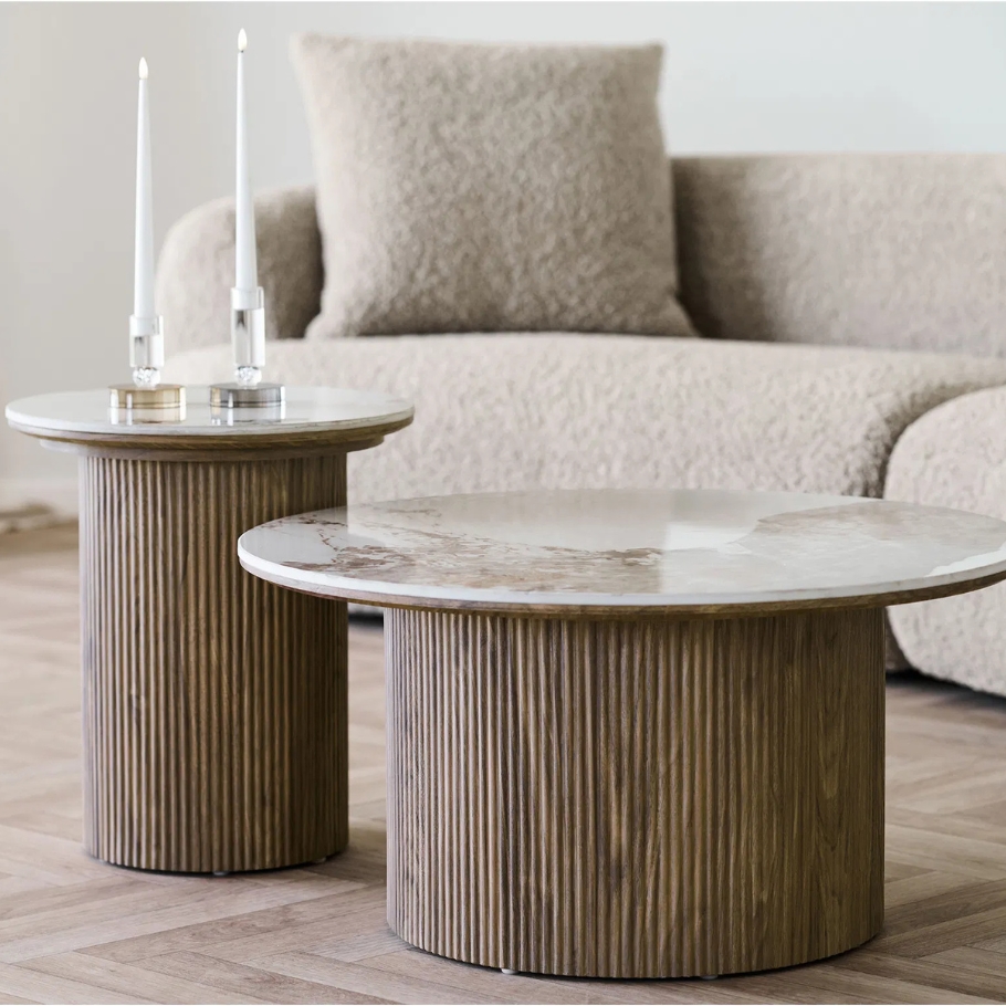 Husum sofabordssættet består af to runde borde, der tilsammen skaber et enkelt og afstemt centrum i stuen. De bløde former og de rolige farver giver et naturligt samspil mellem bordpladens lyse keramikudtryk og de mørkebrune ben, som tilfører varme og dybde til helheden. Resultatet er et let og harmonisk design, der kan indgå ubesværet i både moderne og klassiske hjem.
