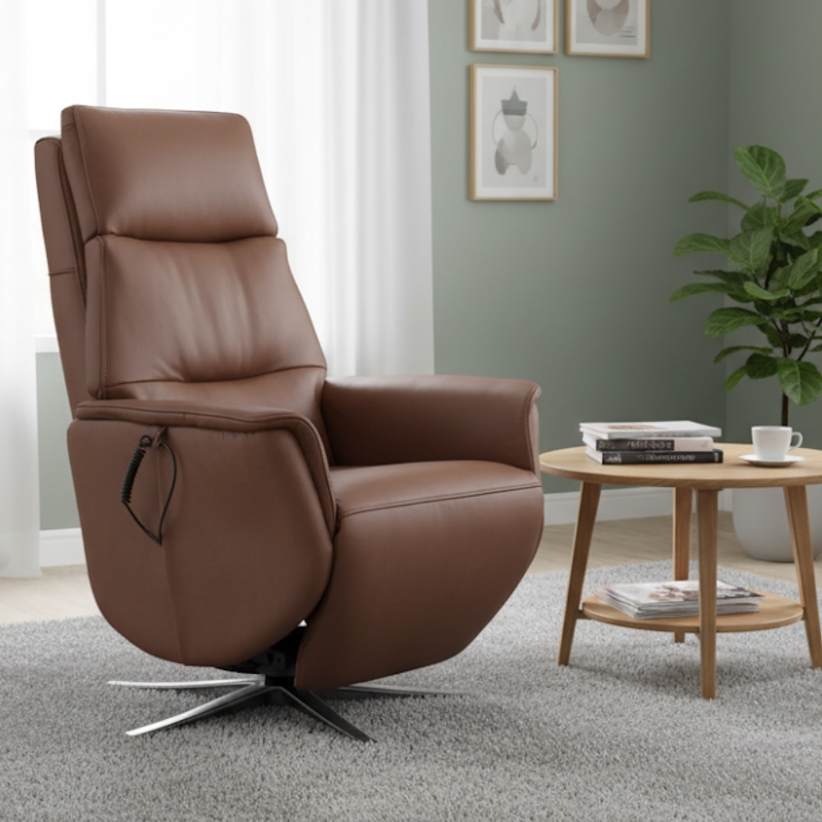 Kim er en løftestol, der kombinerer funktionel komfort med et eksklusivt look. Den cognacfarvede semianilinlæder giver stolen et varmt og sofistikeret udtryk, mens de tre motorer sørger for, at ryglæn, fodskammel og sædeløft justeres præcist efter dine behov.