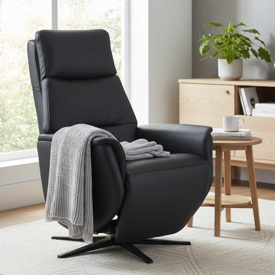 Kim fra Comfort Living forener praktisk funktion med elegant design. Den er betrukket med slidstærkt sort semianilinlæder og udstyret med tre motorer, der styrer ryglæn, fodskammel og sædeløft – alt sammen for at give dig maksimal støtte og bevægelsesfrihed, når du har brug for det.