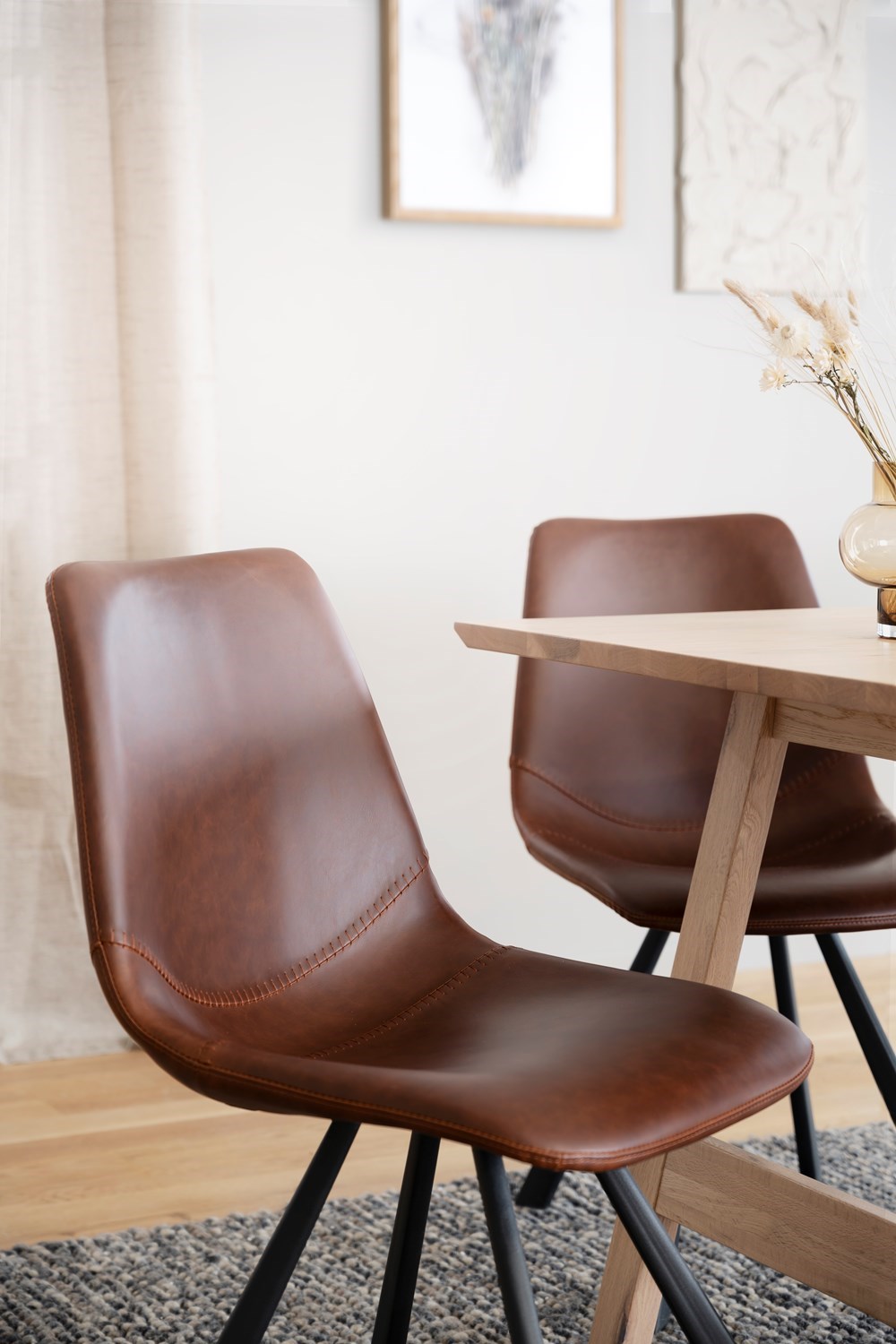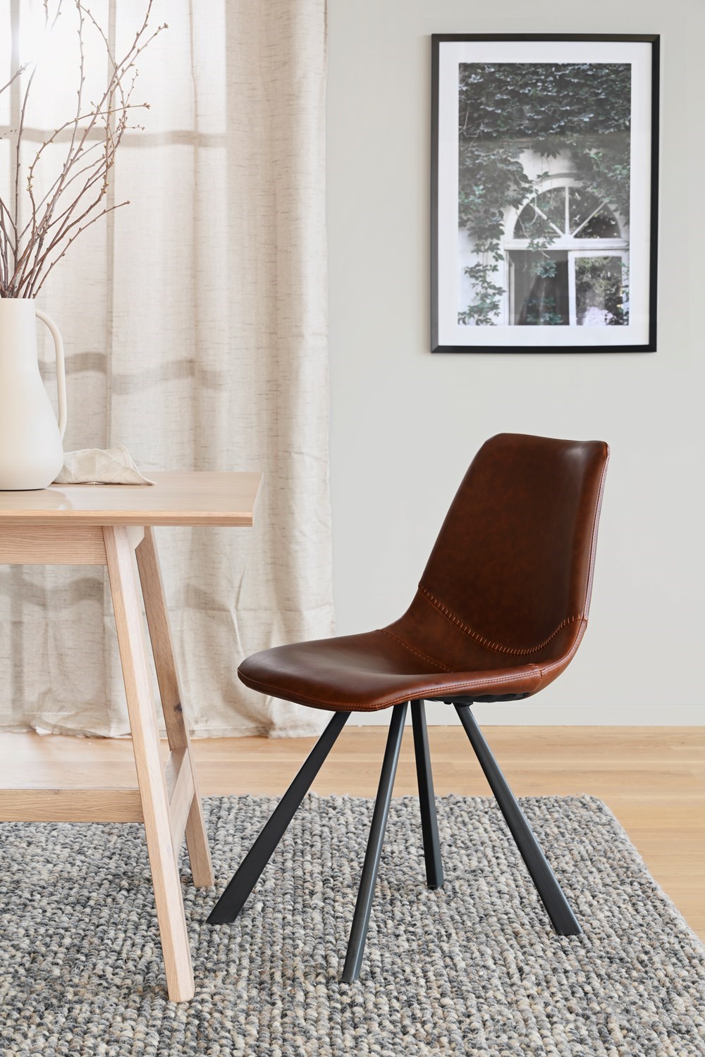 Spisebordsstolen er inspireret af det industrielle design, og dette afspejler designet af Auburn spisebordsstolen. Den elegante stol kan enten vælges i sort, eller brun PU læder.
