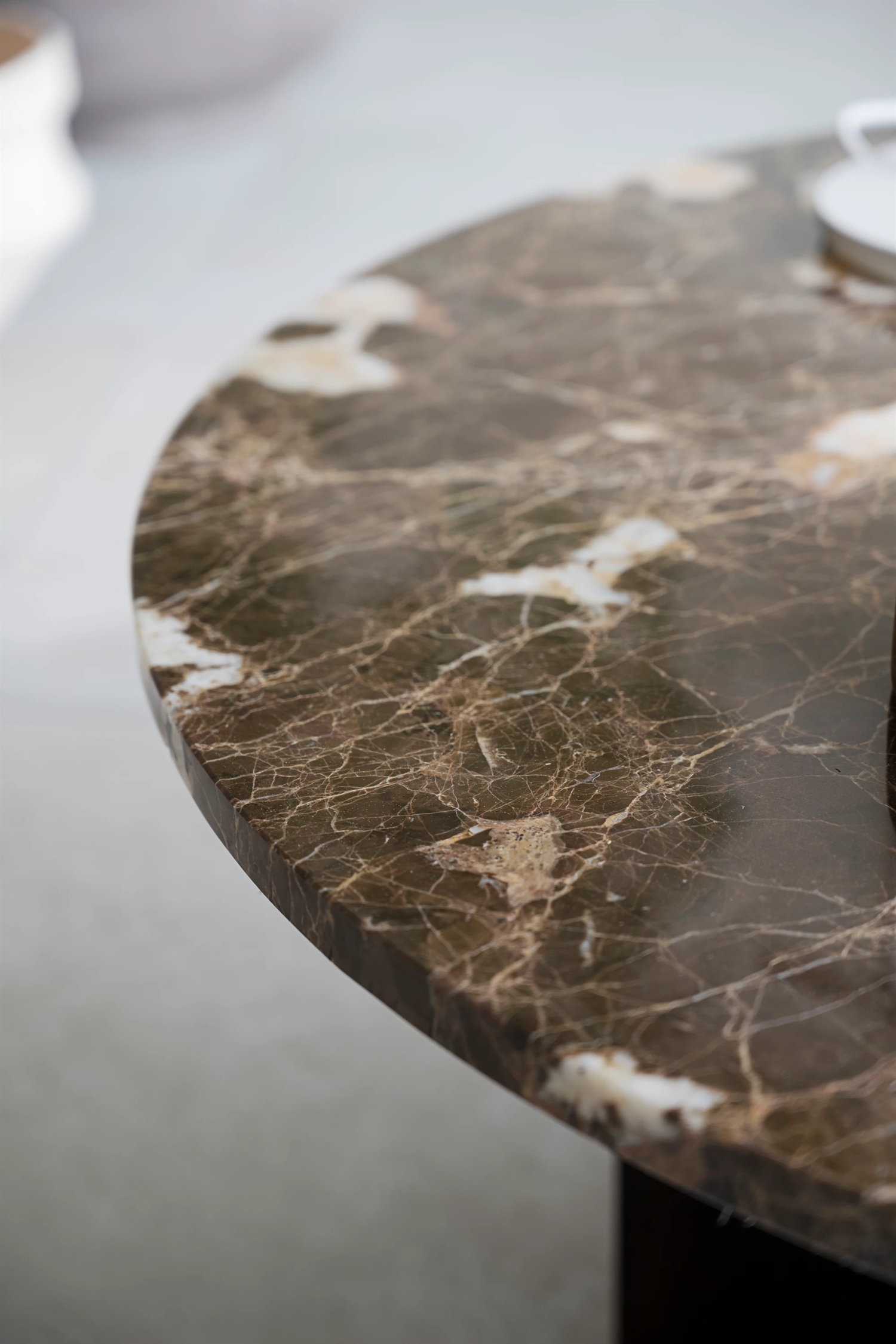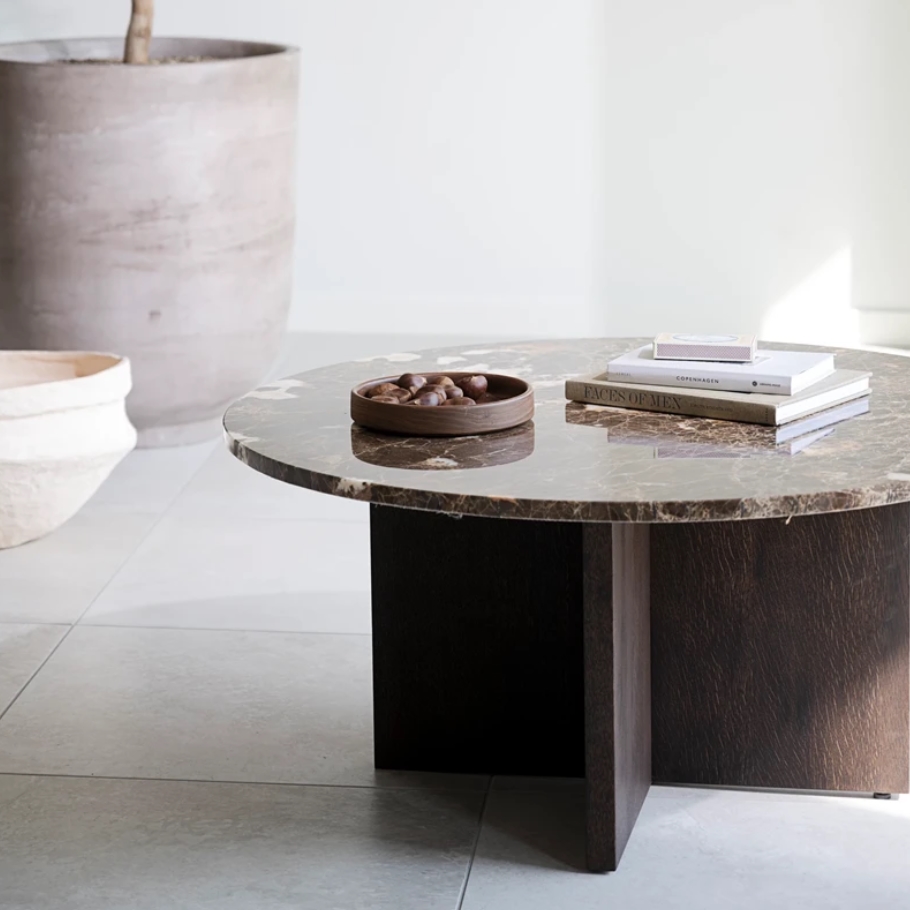 Brooksville sofabordet er designet med en rund bordplade, som er bestående af eksklusiv italiensk Carrara marmor, som er den mest populære samt mest klassiske marmortype. Denne eksklusive marmor bliver kombineret med FSC certificeret træ, som danner et unikt design for det runde sofabord.