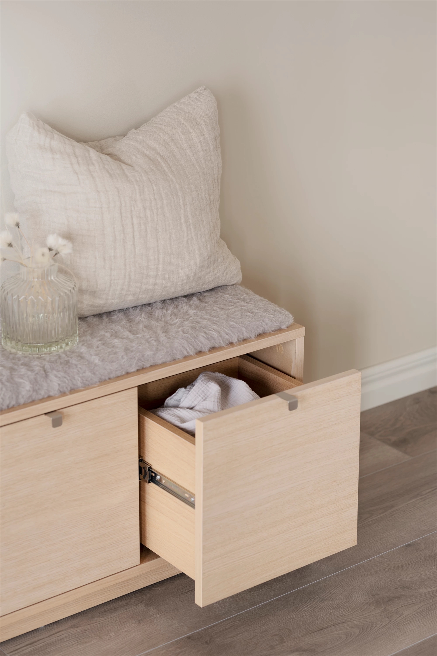 Denne elegante bænk er perfekt til entreen, eller til hjemmet. Confetti bænken, er udført i fineret eg, og med et behageligt sæde. Bænken har plads til opbevaring, med tre rummelige skuffer. Der er rigeligt med opbevaringsplads til at benytte skufferne til sko, eller andet.