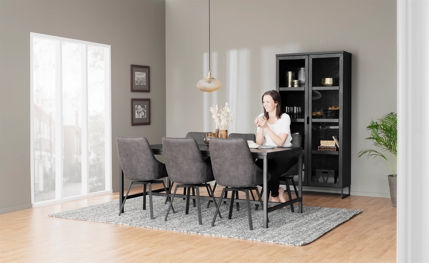 Dette moderne spisebord fra Rowico, er udført i et moderne og elegant design. Bordet har en solid bordplade, som er udført i  sort egetræ, med hele lameller.