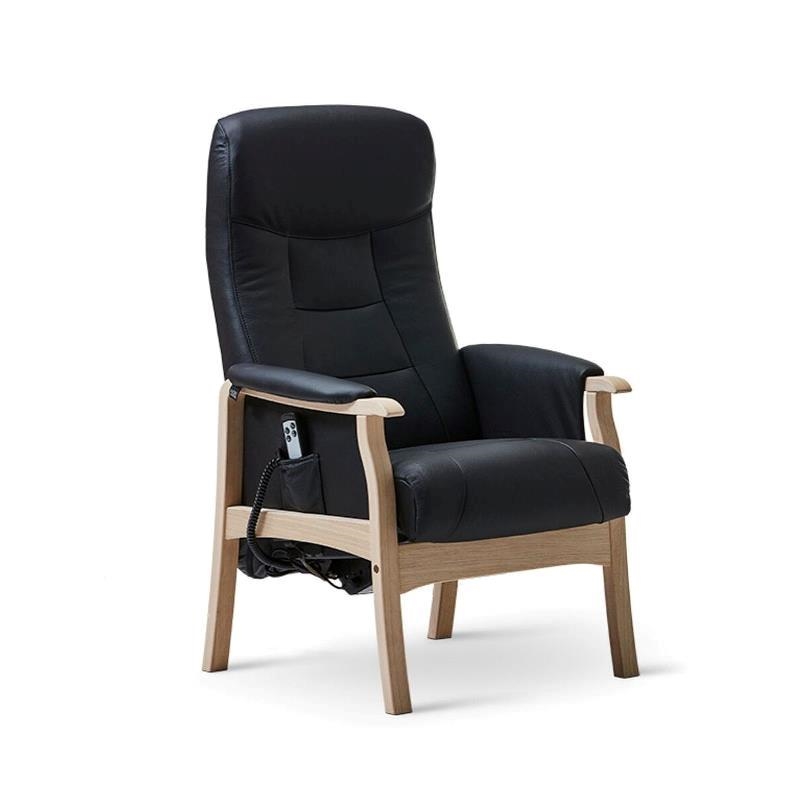 Lækker og komfortabel otiumstol, polstret med sort læder over alt og med stel i flot egetræ. Stolen har 2 motorer til læne-/liggefunktion samt sædeløft. Ideelt til personer med gangbesvær som søger optimal støtte og hjælp i hverdagen.