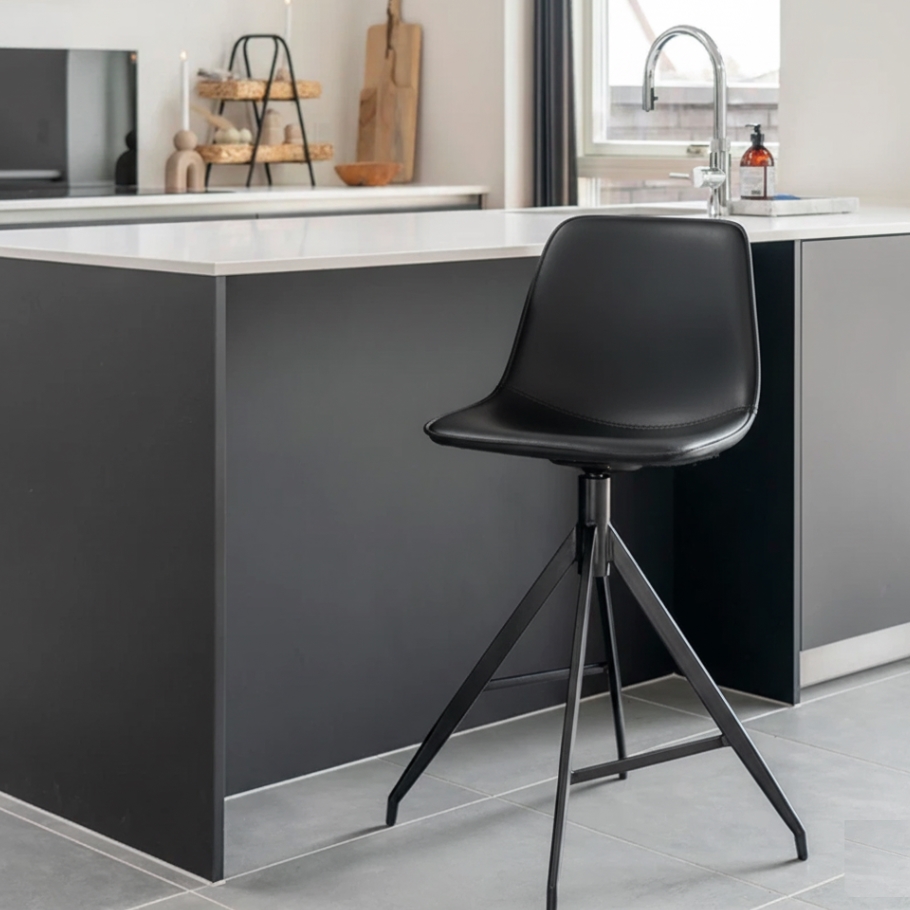 Denne barstol med drej er en høj siddeplads, ideel til køkkenbordet, baren eller en høj spisestue. Udført i elegant sort kunstlæder, også kendt som PU, for et sofistikeret look. Benene er af robust sort materiale, der giver en moderne kant. Dens minimalistiske og chikke design passer til mange indretningsstile. Ergonomisk designet for maksimal komfort.
