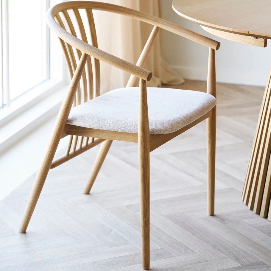 Sigrid Spisebordsstolen er håndlavet med en solid ramme af massivt egetræ, der udstråler naturlig skønhed og sikrer langvarig holdbarhed. Den lyse naturfinish fremhæver træets unikke åremønstre og tilføjer en varm, indbydende charme, der gør hver stol til noget særligt. Sædet er polstret og betrukket med et blødt, sandfarvet stof, der ikke kun tilføjer en elegant kontrast, men også gør stolen behagelig at sidde på, selv under lange middage.