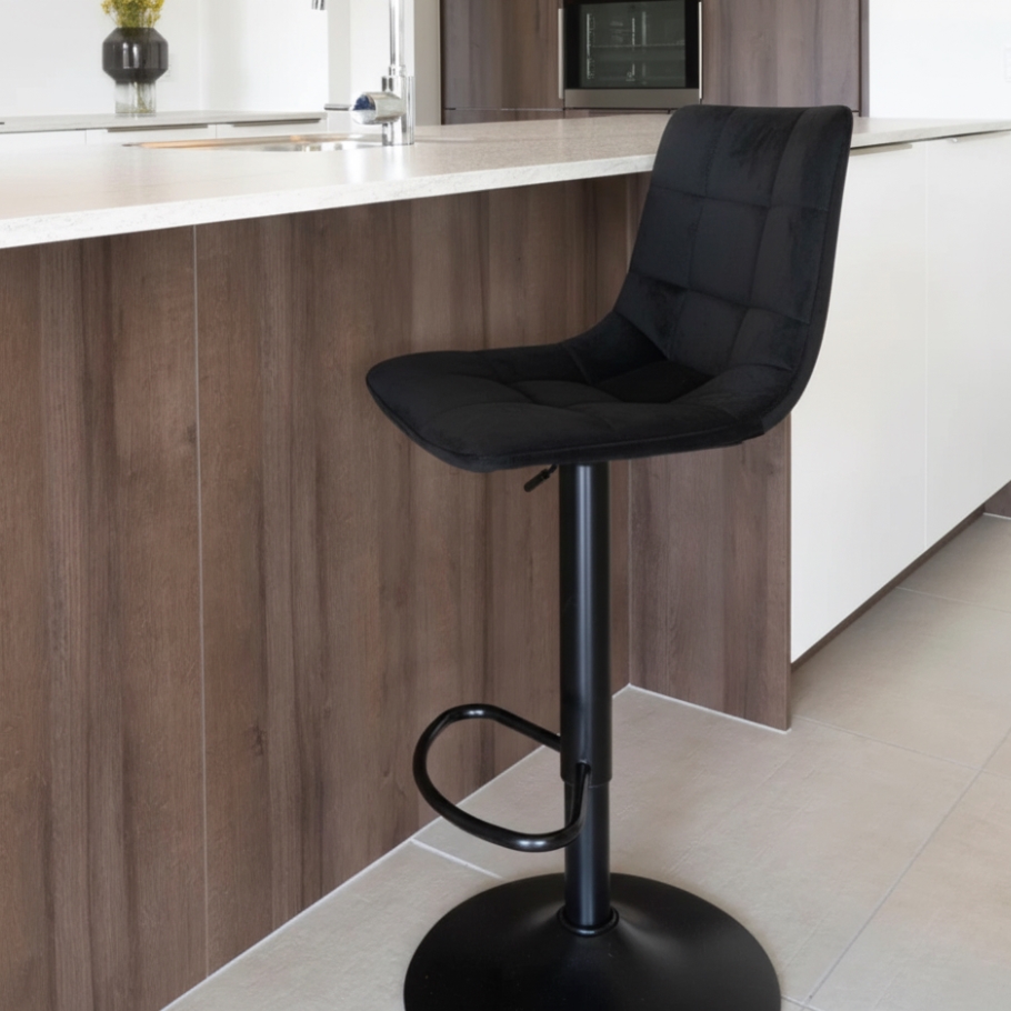 Elevate barstolen i sort velour er en sand udsøgt skønhed. Den bløde velour finish giver en følelse af luksus, mens den tidløse sorte farve sikrer, at den vil være en klassiker i mange år fremover. Denne barstol er ikke kun designet til at se godt ud, men også til at føles godt med dens justerbare højde. Perfekt til dem, der ønsker at kombinere elegance med funktionalitet. Bemærk, barstolene leveres i 2 stk. pr kasse, men prisen er angivet pr. stol